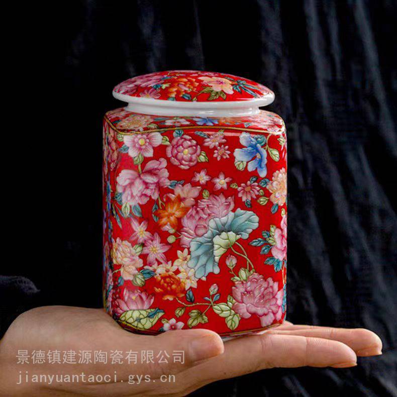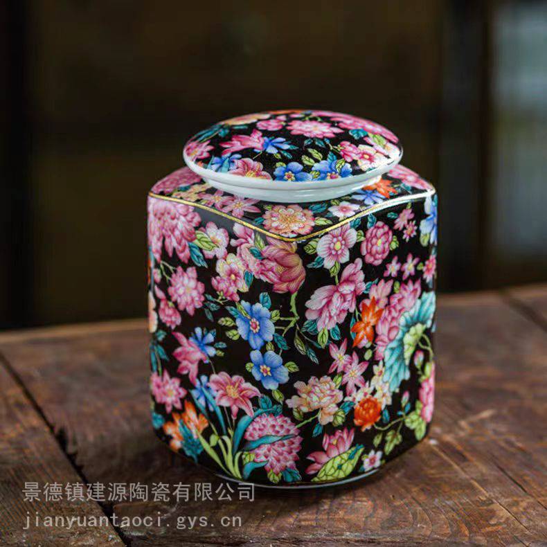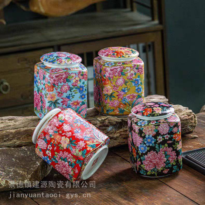 联系电话;13667986633(24小时咨询电话》密封瓷器罐子定制厂 珐琅彩万花陶瓷四方茶叶罐 防潮陶瓷百花罐
