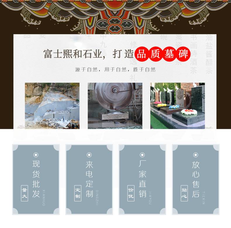 本页信息为福建惠安富士熙和石业有限公司为您提供的"南平墓碑批发 墓石石材批发地址 周边火葬碑***及图片 半手工方式"产品信息,如您想了解更多关于"南平墓碑批发 墓石石材批发地址 周边火葬碑***及图片 半手工方式"价格、型号、厂家请联系厂家,或给厂家留言。 进入店铺