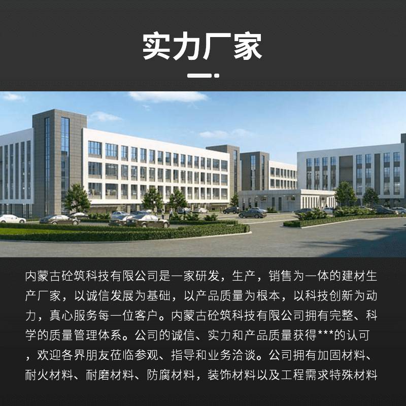 内蒙古砼筑科技有限公司是一家研发,生产,销售为一体的建材生产厂家,以诚信发展为基础,以产品质量为根本,以科技创新为动力,真心服务每一位客户。内蒙古砼筑科技有限公司拥有完整、科学的质量管理体系。公司的诚信、实力和产品质量获得***的认可,欢迎各界朋友莅临参观、指导和业务洽谈。 公司拥有加固材料、耐火材料、耐磨材料、防腐材料,装饰材料以及工程需求特殊材料等***技术和生产能力。公司主营产品:高强无收缩灌浆料、环氧灌浆料,CGM二次灌浆料,支座灌浆料(支座砂浆)风电底座灌浆料,防静电不发火耐磨硬化剂,环氧树脂胶泥、抢修料、环氧修补砂浆、双组份聚合物防水砂浆、聚合物粘结砂浆、聚合物抗裂抹面砂浆、聚合物防水砂浆,玻化微珠保温砂浆、自流平水泥、、环氧界面剂、膨胀水泥、双快水泥、速凝剂、压浆剂、瓷砖胶、粘钢胶、植筋胶,金刚砂耐磨料,橡胶喷涂防水材料,道钉锚固剂,一次座浆料,轨道胶泥,J302混凝土再浇剂,混凝土薄层修补料,沥青修补料,粘钢胶,植筋胶,灌注胶,碳布胶,无机铝盐防水砂浆,耐火涂料,聚脲涂料等100多种加固修补材料,耐火材料,防腐材料。 内蒙古砼筑科技有限公司分别在北京,西安,郑州,太原,济南,石家庄,成都,昆明,合肥。广州,乌鲁木齐,沈阳,长春,兰州,长沙,银川,哈尔滨福州,保定,杭州,福州,张家口,内蒙古呼和浩特,赤峰,唐山,重庆,包头,青岛南京,等50多个地区建有分厂和仓库满足客户就近采购,就近发货的服务宗旨。