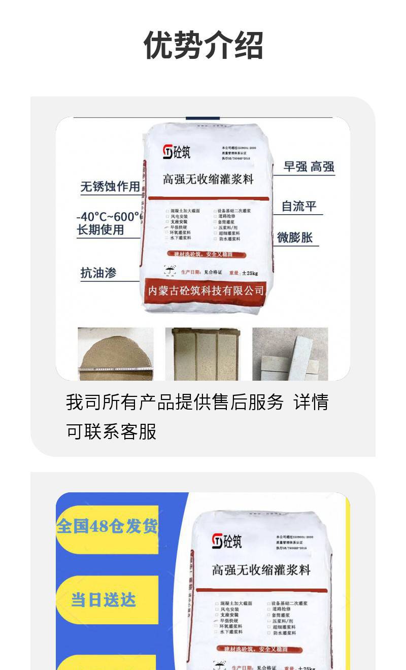 本页信息为内蒙古砼筑科技有限公司为您提供的"巨高强度高流动性施工速度快 高强无收缩灌浆料"产品信息,如您想了解更多关于"巨高强度高流动性施工速度快 高强无收缩灌浆料"价格、型号、厂家请联系厂家,或给厂家留言。 进入店铺