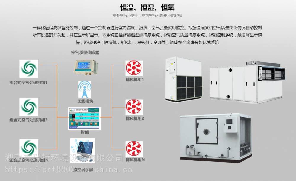 湖南克瑞特环境设备有限公司根据客户对库房环境的高要求,设计开发的对库房环境实时监测、消毒净化、集成智能控制的一套库房环境一体化解决方案,达到通风除湿温控净化的目的,实现库房环境信息化、精准化的全智能控制。15--673--///17*168--7