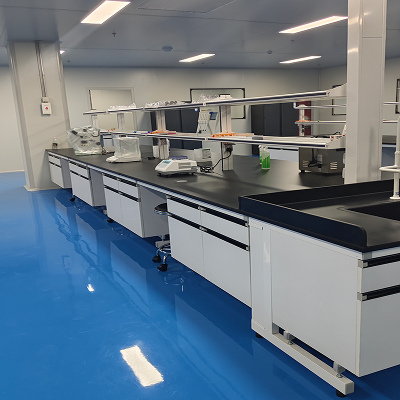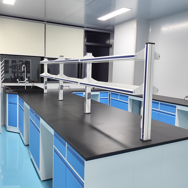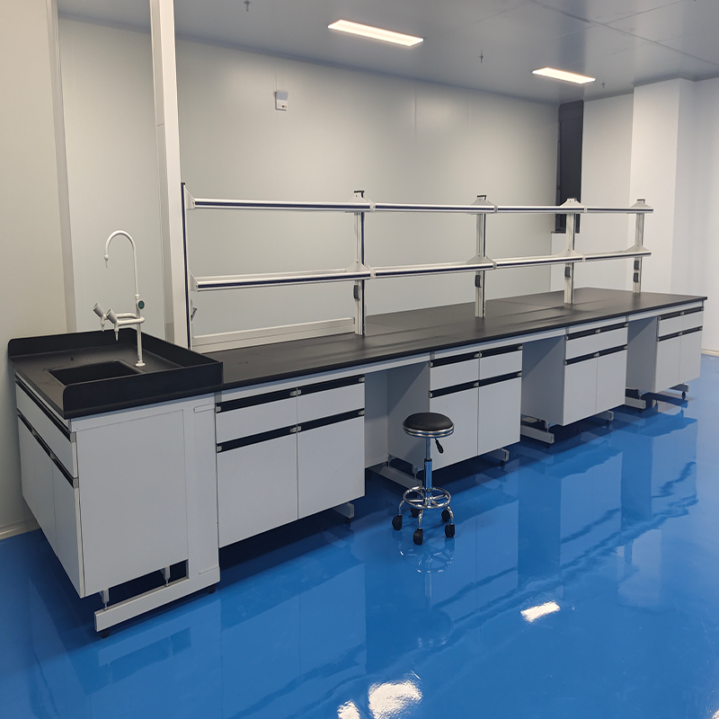 主框架40*60*1.2mm厚冷轧钢管,气体保护焊接,环氧树脂粉末自动喷涂流水线喷涂而成。柜体18mm厚三聚氰胺饰面板。数控下料,贴标钻孔。台面根据不同实验要求,可采用实芯理化板、环氧树脂板、陶瓷面板等。