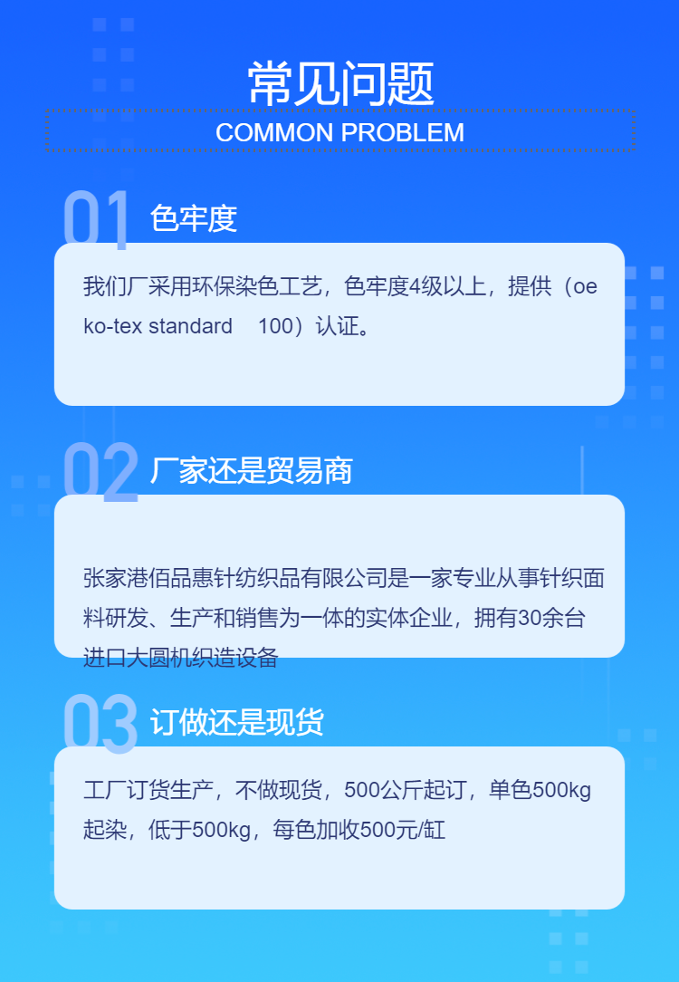 张家港佰品惠针纺织品有限公司是一家专业从事针织面料研发、生产和销售为一体的实体企业, 拥有雄厚的技术力量,精益求精的质量意识,引进各类20余台进口针织大圆机设备, 生产的单、双面针织布均符合国际生态纺织品标准(oeko-tex standard 100)要求。 全面通过ITS、STR、SGS检测。 本厂专业生产纬编针织面料,内衣面料、T恤面料、泳装瑜伽服、再生面料、校服面料等 成分有:锦、棉、人造纤维、化纤(涤纶)、晴纶、羊毛、再生原料、等各类混纺纤维。 种类有:汗布类:棉氨、涤氨(阳离子)、黏氨、锦氨等 双面类:涤盖棉、健康布、棉毛布、空气层、罗马布、华夫格、楼梯布 色织类:单双面大小循环面料、针织仿牛仔布 毛圈类:含毛巾布、鱼鳞布、粗针稀松大毛圈 绒布类:单面绒、双面绒、卫衣绒布、磨毛布 网眼类:珠地网眼布、经编网眼布、蜂巢布(鸟眼布) 罗纹类:移圈罗纹、法国罗纹、提花罗纹 再生类:再生涤、再生棉面料 功能性:吸湿排汗coolmax、抗静电、抗紫外线、抑菌、阻燃、三防、荧光等 综合类:金丝、银丝面料,羊毛布、竹炭面料、导电丝面料、段彩系类 还能为广大客户提供各种针织面料印花、植绒、烂花烧花、烫金烫银、 压花、压皱等后整理 设备 1.日本电脑单面调线机2台 30” 有16G、18G、20G、24G、28G、32G、36G 可织10S/2-60S各种粗细纱线的平纹、网眼、复合网眼、小毛圈等大循环彩条布 2、德国产双面小提花机2台 30”22G 28G 可织双面提花等各种织物 3、台湾产双面大圆机 34”6台18G、20G 24G 28G 30G 32G 36G可织各种双面布、罗和氨纶罗纹。 4、单面开幅大圆机32 、30、34寸 10台,18-40针 5、罗纹大圆机30”2台18G 14G, 6.卫衣机2台