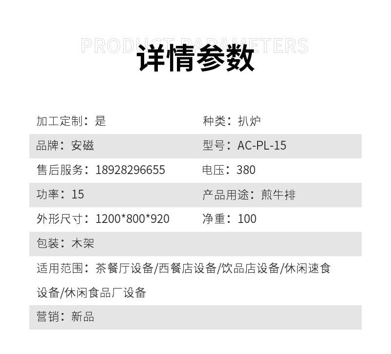| 功率:15Kw | 产品用途:煎牛排 | 外形尺寸:1200*800*920mm |