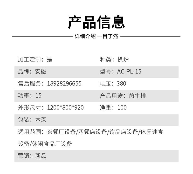 | 功率:15Kw | 产品用途:煎牛排 | 外形尺寸:1200*800*920mm |