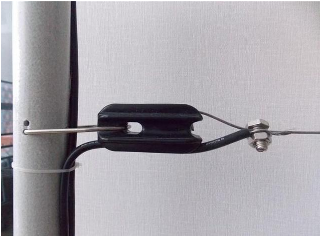 先用手电钻在受力柱上面打孔(默认是打好的),然后用挂钩穿过黑色绝缘子,再挂在柱子上(如下图),线夹的作用就是把合金线给夹住,以免合金线脱落。(柱子边上的黑色线是高压线给围栏供电用的,下文会讲解到)