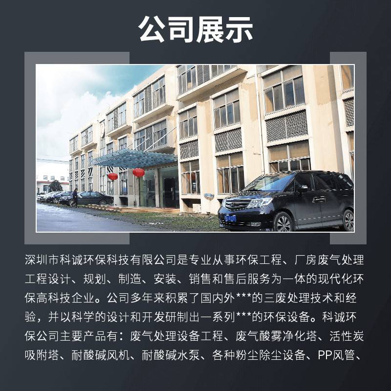 深圳市科诚环保科技有限公司是专业从事环保工程、厂房废气处理工程设计、规划、制造、安装、销售和售后服务为一体的现代化环保高科技企业。公司多年来积累了国内外***的三废处理技术和经验,并以科学的设计和开发研制出一系列***的环保设备。科诚环保公司主要产品有:废气处理设备工程、废气酸雾净化塔、活性炭吸附塔、耐酸碱风机、耐酸碱水泵、各种粉尘除尘设备、PP风管、镀锌螺旋风管、FRP风机、集尘设备工程、高效UV氧化设备、除油设备、生物吸收塔设备、除臭雾化设备等各种环保设备及配件。本公司生产的系列环保设备广泛应用于PCB电路板厂、光电厂、化工、医药、电子、半导体、光伏新能源、电镀、有色金属、化纤、造纸、冶金、电力、环保、食品、垃圾站等业行业,并得到广大企业的好评和品质***的环保品牌。公司拥有专业的生产设备、专业技术人才和专业的施工队伍。本公司“以质量求生存、以创新求发展、诚信率先、顾客至上”为企业宗旨,以“***创新、诚信为本、科学发展的企业精神和质量率先、服务至上”为经营理念,科诚环保愿与广大企业朋友一起携手合作、共创美好未来、造福子孙后代,共同促进环境保护事业的进步与发展