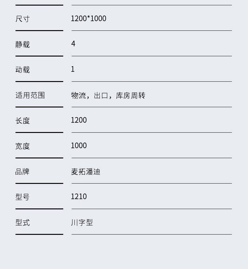 | 适用范围:物流,出口,库房周转 | 长度:1200 | 宽度:1000mm |