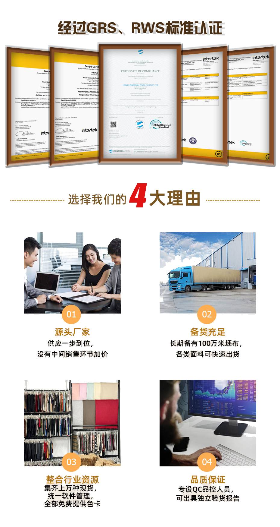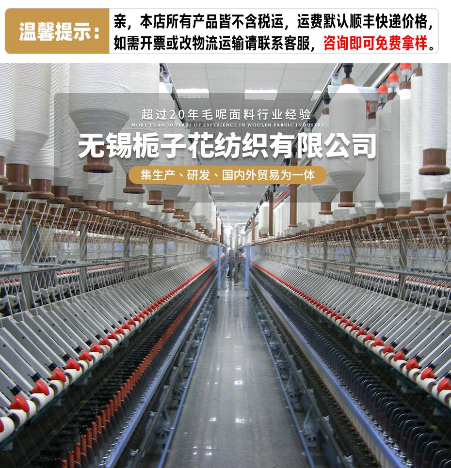 无锡栀子花纺织有限公司是专业生产、研发、销售毛呢面料的厂家,二十多年来一直专注于秋冬大衣面料。主要产品类型有双面呢、顺毛呢、法兰呢、麦尔登呢、羊绒呢、阿尔巴卡毛呢等。 我们生产的全部面料产品皆通过全球再生标准(GRS)和责任羊毛标准(RWS)认证,面料成分可出具第三方机构的检测报告,***真材实料。可生产美标US和欧标IOS产品,支持跨境外贸,为国际国内多家知名服装、面料品牌商家持续供货超20年,产品远销欧美、中东、日韩、东南亚等多个国家和地区。 自有厂房8000㎡,拥有全进口纺纱生产线3条、高速数字智能化织布机70台,另有定向合作整理厂超10家,***反应快速。我们还专设小单快返生产线,面料的工艺、成分、花色、克重等参数皆可个性化定制,3米起订、7天打样、15天交货。同时常备100万米以上的各类面料坯布,***大货交期不超过30天。 我们还整合了上百家同行工厂资源,自有1000㎡的现货展厅内存有上万种不同款式的面料,统一使用***软件系统管理货源。方便客户快速找款,并及时获取所需的现货面料。 公司旗下有一支独立的面料研发团队,由一名拥有30年毛呢面料研发经验的总监带领,其他专业院校出身设计师12名。我们能快速、敏感地掌握毛呢面料市场流行趋势,帮助客户的产品快速完成转型升级,每年可开发500组以上的时尚新品,现在咨询客服即可领取当季新款样布。