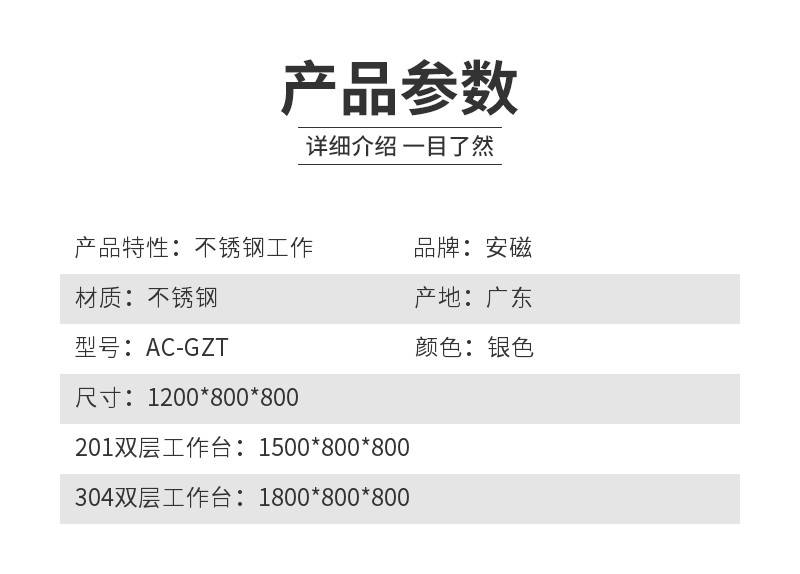 | 尺寸:1200*800*800cm | 201双层工作台:1500*800*800 | 304双层工作台:1800*800*800 |