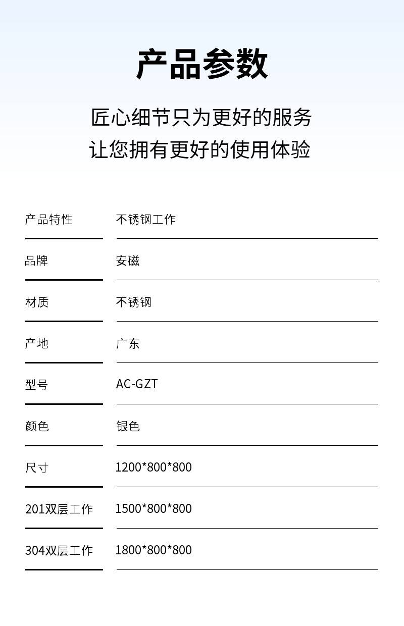 | 尺寸:1200*800*800cm | 201双层工作台:1500*800*800 | 304双层工作台:1800*800*800 |