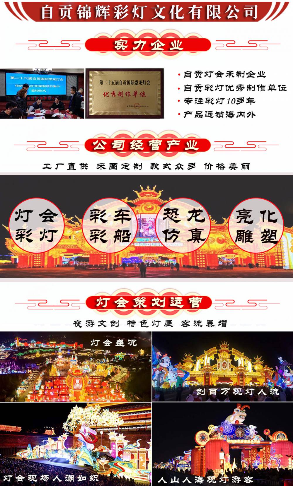 自贡锦辉彩灯文化有限公司成立于2012年,位于四川自贡贡井工业开发区。是一家专业从事彩灯、灯会、彩车、彩船、仿真恐龙昆虫以及城市亮化的设计、制作、展览、运营、自贡灯会专业品牌文化化传承的实业型文化产业公司。注册资本500万元。?公司实力雄厚,为自贡彩灯产业***。 公司设有创意设计中心、营销运营中心和工程制作中心三大核心机构,拥有一批创意设计精良、制作安装严谨、诚信灵活经营、务实高效管理的技术和管理人才,始终秉承中国“工匠精神”,在传承中不断探索创新自贡彩灯文化产业发展新途径。 公司技术研发团队专业水平***,可为客户提供多对一团队服务,量身定制、限度贴合企业特征、满足企业发展及宣传需求。公司成立十余年来,已帮助500+企业实现灯会、彩车策划制作展出业务,在国内大中城市树立了良好的***,客户行业覆盖房产、***、公园、商场、景区、等多个领域。公司展品深受海外游客以及当地***和媒体好评,拥有了一批优质、稳定的长期合作伙伴。 公司以“创世界***”、“用心铸造品牌、用灯点亮世界”为文化理念,凭借公司团队精湛的技艺,精诚的服务,在***获得广泛的赞誉,得到客户广泛的认可锦辉彩灯一直秉承专业、诚信、进取的服务核心,旨在通过自己不懈的努力,为企业连接一切商机,帮助客户在新时代和环境中保持优势,与客户风雨同行、共同成长、分享喜悦. ? ? ? ?在彩灯文化产业链的逐步完善拓展中,公司还积累了大量的城市亮化美化和景观雕塑的创意策划设计制作经验,先后在国内一二线城市成功打造城市街道、商业街区,旅游景点和主题乐园。公司多年的业绩和品质赢得了若多高规格的殊荣和资质,自贡市锦辉彩灯文化有限公司是你可信赖的合作伙伴,选择锦辉、互助共赢!