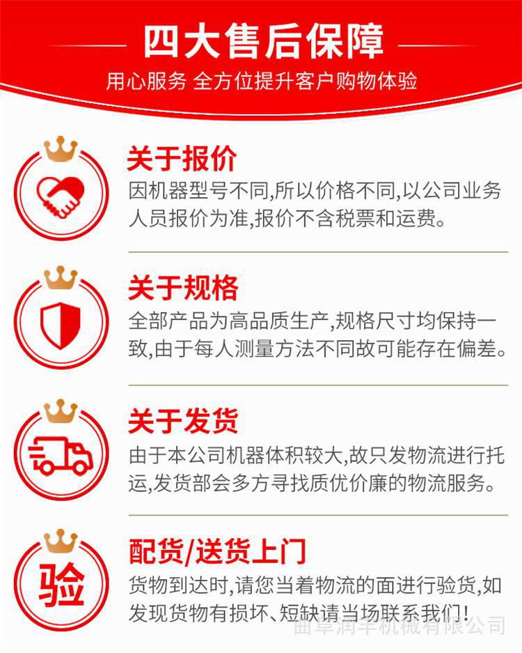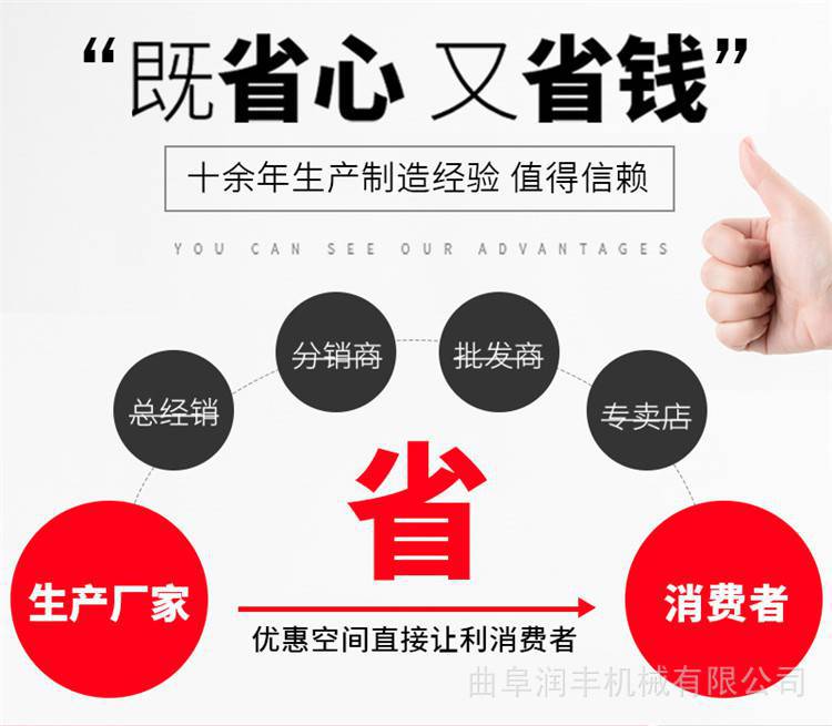 曲阜润丰机械有限公司坐落于孔子故里---山东省曲阜市,是专业从事工程,生物饲料再生资源的研究,农业机械等行业的生产研制、开发、生产和推广的现代生产技术及配套设备的农业机械制造厂!多年来,我厂家先后经营10余年来采购国家科研机构、社会各界的发明创造者合作,坚持“人无我有,人有我优,人优我精”的经营策略,秉承“以市场为准则,以新创科技为先导” “以德做人、以诚做事”,的经营理念,扎实地走科研与生产相结合的道路。先后推出:撒料车 TMR搅拌机 清粪车 青贮取料机 铡草粉碎揉丝机 打捆包膜机 吸粮机 提升机 履带式开沟机 田园管理机 旋耕机 喷雾器 弥雾机 (1)农作物秸杆的综合利用配套设备;(2)中小型配合饲料;(3)畜禽多用颗粒饲料加工;(4)粮食深加工;(5)工程机械等五大系列上百种规格的。 “润丰”牌系列产品。常年来受到了各界的一致好评, “润丰”每个员工坚持“质量铸就品牌”的企业宗旨致力于提升企业核心竞争力,铸造鲜明的企业文化,追求可持续发展 打造强势品牌,实现科技富民,产业报国之宏愿。 “润丰”人热忱期待着您对公司给予更多的关爱和支持。 “润丰”人热忱期待着您对公司给予更多的关爱和支持。 对于产品质量:我们要求精益求精! 对于服务:我们永远用微笑对待每位客户! 对于售后:我们用真诚的态度为每位客户分担! 厂家直销,欢迎来电订购
