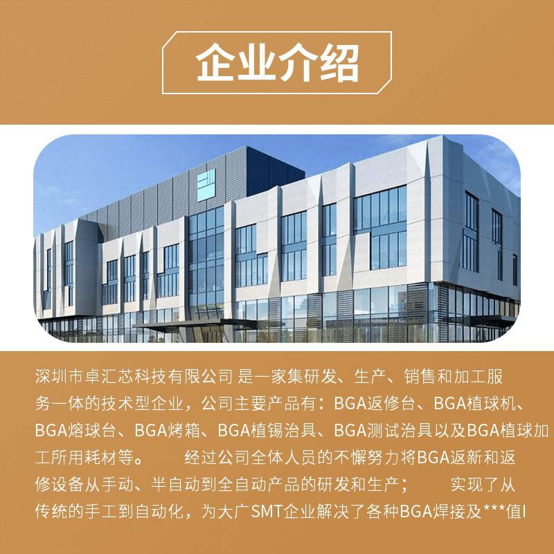 深圳市卓汇芯科技有限公司 是一家集研发、生产、销售和加工服务一体的技术型企业,公司主要产品有:BGA返修台、BGA植球机、BGA熔球台、BGA烤箱、BGA植锡治具、BGA测试治具以及BGA植球加工所用耗材等。 经过公司全体人员的不懈努力将BGA返新和返修设备从手动、半自动到全自动产品的研发和生产; 实现了从传统的手工到自动化,为大广SMT企业解决了各种BGA焊接及***值IC芯片重新利用的难题。 在芯片返新方面从单系列封装返新到全系列封装返新(QFN、QFP、SOJ、BGA、SOP等等)从而实实在在的为各大企业节省成本。 卓汇芯科技以专业的技术及技术设备对外承接批量芯片返新加工服务(芯片IC 拆卸、除胶、除锡、植球、磨字、打字、镀锡、成型、编带等),经我司返新加工后的芯片可直接上机贴片重新利用。 公司秉承“诚信、专业、节约、创新”的经营理念,坚持“以需求为向导、以技术为基础、以质量为根本、以营销为龙头、以服务为宗旨”的原则,不断的深化研发,进一步提高技术服务和管理水平。 饮水思源,我们诚挚的感谢各位新老客户对我们公司长期以来不懈的支持; 投桃报李,我们将以更加优质、人性化的产品,更加完善的服务回报社会各界的厚爱。 卓汇芯科技将始终坚持“诚信、专业、节约、创新”的服务宗旨和理念,与您携手共创美好未来。