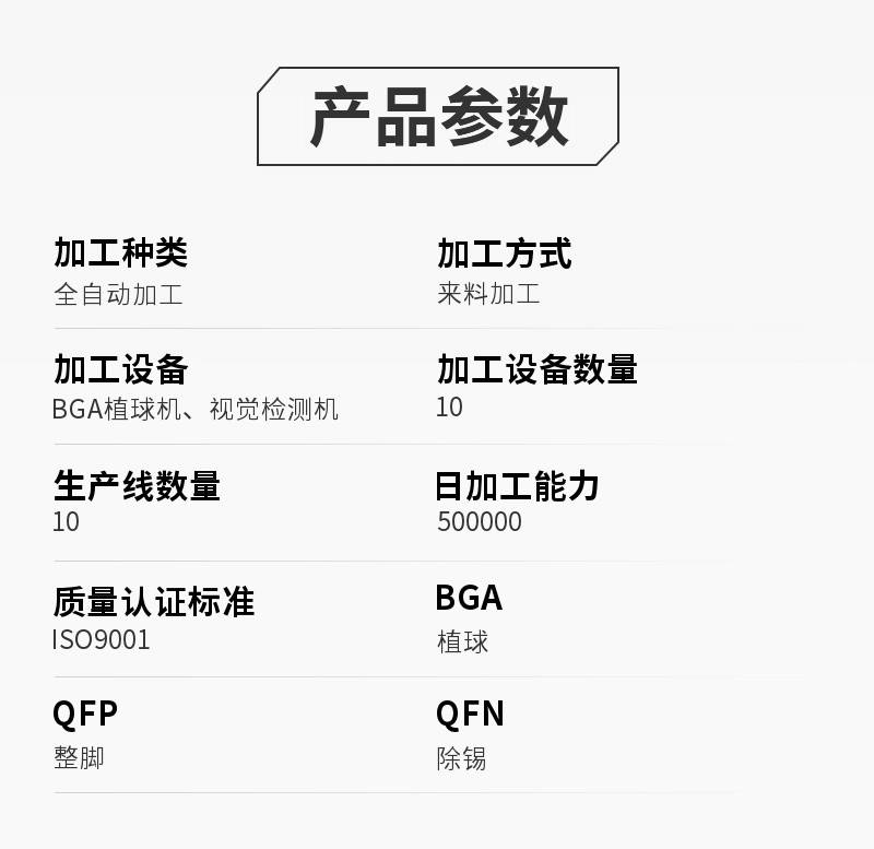 | 加工种类:全自动加工 | 加工方式:来料加工 | 加工设备:BGA植球机、视觉检测机 |