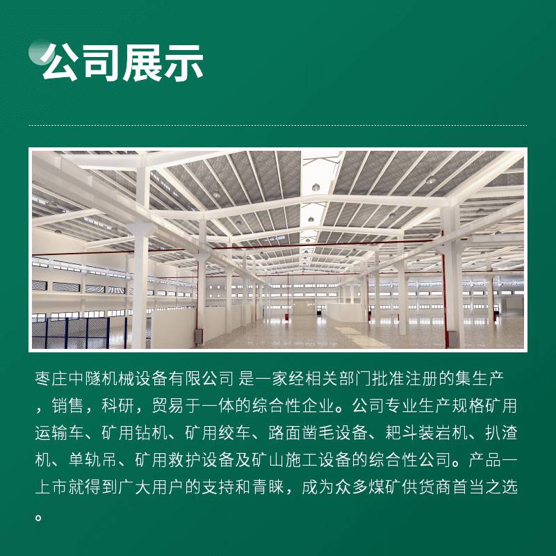 枣庄中隧机械设备有限公司 是一家经国家相关部门批准注册的集生产,销售,科研,贸易于一体的综合性企业。公司专业生产规格矿用运输车、矿用钻机、矿用绞车、路面凿毛设备、耙斗装岩机、扒渣机、单轨吊、矿用救护设备及矿山施工设备的综合性公司。产品一上市就得到广大用户的支持和青睐,成为众多煤矿供货商首当之选。 公司座落在山东省枣庄市,位于孔孟之乡,礼仪之邦,交通便利。公司始建于2019年,是枣庄煤矿建设中专营矿建物资、工贸一体的大型股份制企业。现有员工300余人,各类专业技术管理人员50余人,占地面积约8600平方米。公司凭着良好的信用、优良的服务与多家企业建立了牢固的物资供应关系。 公司长期致力于科技与市场接轨、紧跟改革开发的大好形势,将科技商品化、市场化、产业化,与煤炭科学设计院、冶金设计院、煤炭科技大学等多家知名科研机构合作,开发研究适应市场的各种煤矿用工具及机械设备,不仅供给国内的煤矿和各类经营贸易公司,而且产品销售到韩国等东南亚,非洲及中 东地区,深受广大客户的欢迎。