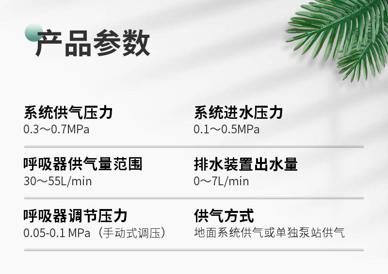 | 重量:15kg | 呼吸器供气量范围:30—55L/min(0.3MPa) | 呼吸器调节压力范围:0.05—0.1MPa |