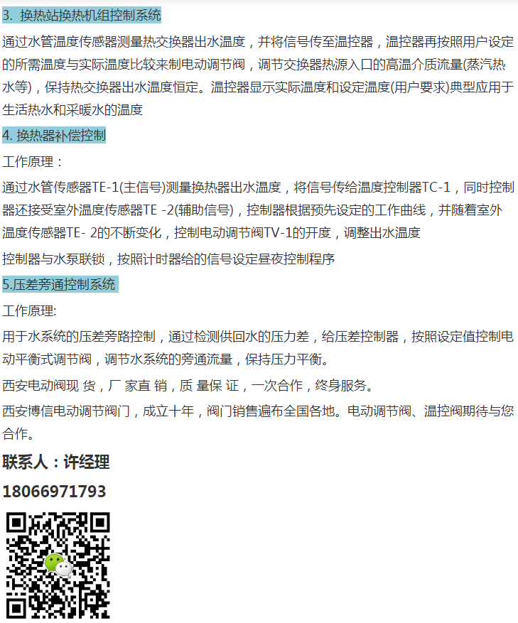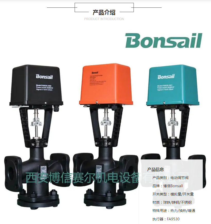 西安博信赛尔机电设备有限公司是致力于供暖及暖通空调系统自控产品研发、生产与销售的专 业设备服务提供商。产品适用于水、蒸汽、乙二醇介质系统的温度与压力调节、冷热介质计量及上报,换热机组控制,暖通空调及新风机组控制等领域。自成立以来就以向用户提供优 质产品和优 质服务为企业生存发展之本,产品与服务受到业 界广 泛用户的肯定。 本公司现有产品电动调节阀、电动温控阀、压差旁通阀、电动平衡式调节阀;电动蝶阀、电动球阀;电磁流量计、超声波热量表;控制仪表、传感器、变送器、温湿度控制箱、压力/压差控制箱等。其中电动调节阀产品在2008年就一次性通过西安市产品质量监督检验所检验,并在多个省市重 点项 目广 泛应用。 公司提供产品能够对温度、湿度、压力、流量等参数进行***调节,适用于空调、制冷、采暖、通风等领域的自动及远程控制。 为保 证客户所选择设备的运行达到理想、完 美的状态,博信在每台设备的售前售后都进行全 方 位服务跟踪:设备出厂前严格复检、安装前技术咨询、运行中精心调试、免费专 业操作人员培训、安装后建立用户服务档案、定期使用情况回访、根据用户的具体要求提供专 业技术咨询、指导及上门服务等等。博信强烈的服务意识和不断完善的服务体系是客户满意度不断提高的有力保 证。 西安博信赛尔将坚持以提高产品质量、完善服务体系为企业宗旨,秉承“博众长、信为本”的企业理念,为用户提供恒久优 质的产品与服务。 公司主营产品附录: 直行程电动调节阀(DN15-450,二通三通,铸铁、球墨铸铁、铸钢、不锈钢) VAF、VAL、V6电动调节阀一一国产执行器 VVE电动调节阀一一西门子执行器 VVH电动调节阀一一霍尼韦尔执行器 电动执行器 西门子、霍尼韦尔电动执行器 国产直行程执行器(推力为500N-26000N) 角行程电动阀门 电动球阀(法兰、螺纹) 电动蝶阀(法兰、对夹) 电磁流量计与超声波热量表 其它配套控制仪表、传感器、变送器 非标或大口径阀门定制
