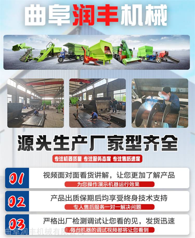 曲阜润丰机械有限公司坐落于孔子故里---山东省曲阜市,是专业从事工程,生物饲料再生资源的研究,农业机械等行业的生产研制、开发、生产和推广的现代生产技术及配套设备的农业机械制造厂!多年来,我厂家先后经营10余年来采购国家科研机构、社会各界的发明创造者合作,坚持“人无我有,人有我优,人优我精”的经营策略,秉承“以市场为准则,以新创科技为先导” “以德做人、以诚做事”,的经营理念,扎实地走科研与生产相结合的道路。先后推出:撒料车 TMR搅拌机 清粪车 青贮取料机 铡草粉碎揉丝机 打捆包膜机 吸粮机 提升机 履带式开沟机 田园管理机 旋耕机 喷雾器 弥雾机 (1)农作物秸杆的综合利用配套设备;(2)中小型配合饲料;(3)畜禽多用颗粒饲料加工;(4)粮食深加工;(5)工程机械等五大系列上百种规格的。 “润丰”牌系列产品。常年来受到了各界的一致好评, “润丰”每个员工坚持“质量铸就品牌”的企业宗旨致力于提升企业核心竞争力,铸造鲜明的企业文化,追求可持续发展 打造强势品牌,实现科技富民,产业报国之宏愿。 “润丰”人热忱期待着您对公司给予更多的关爱和支持。 “润丰”人热忱期待着您对公司给予更多的关爱和支持。 对于产品质量:我们要求精益求精! 对于服务:我们永远用微笑对待每位客户! 对于售后:我们用真诚的态度为每位客户分担! 厂家直销,欢迎来电订购