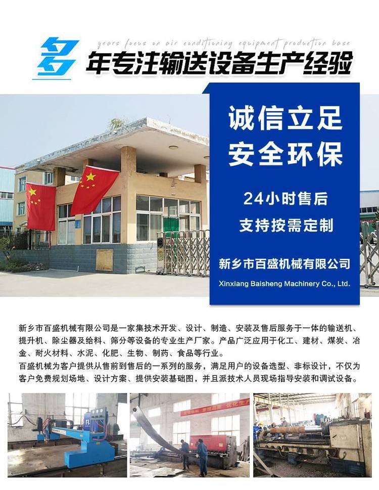 新乡市百盛机械有限公司是一家集研发、生产、销售、服务于一体的企业,现拥有三个大型生产车间(输送车间、除尘车间和提升车间)。 新乡百盛机械有限公司生产的除尘设备包括:气箱除尘器、布袋除尘器、脉冲除尘器、旋风除尘器、单机除尘器以及脱硫塔等; 提升机设备包括:TD带式斗式提 升机、TH、HL链条斗式提升机、NE板链斗式提升机、TL捞坑、脱水斗式提升机等; 输送设备有:螺旋输送机、链式输送机、皮带输送机、鳞板输送机、链斗输送机等另有各种振动筛、给料机设备等,公司愿以“精诚合作,互利互赢”的思想理念,脚踏实地,稳扎稳打地为用户生产高质量、高附加值的设备,诚邀广大客户共叙友谊,洽谈合作! ***专业才能创造独***值,投机没有未来!