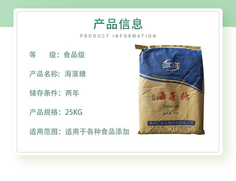 | 化学名:海藻糖 | 有效期:2年 | 注意事项:食品添加剂不能直接食用 |