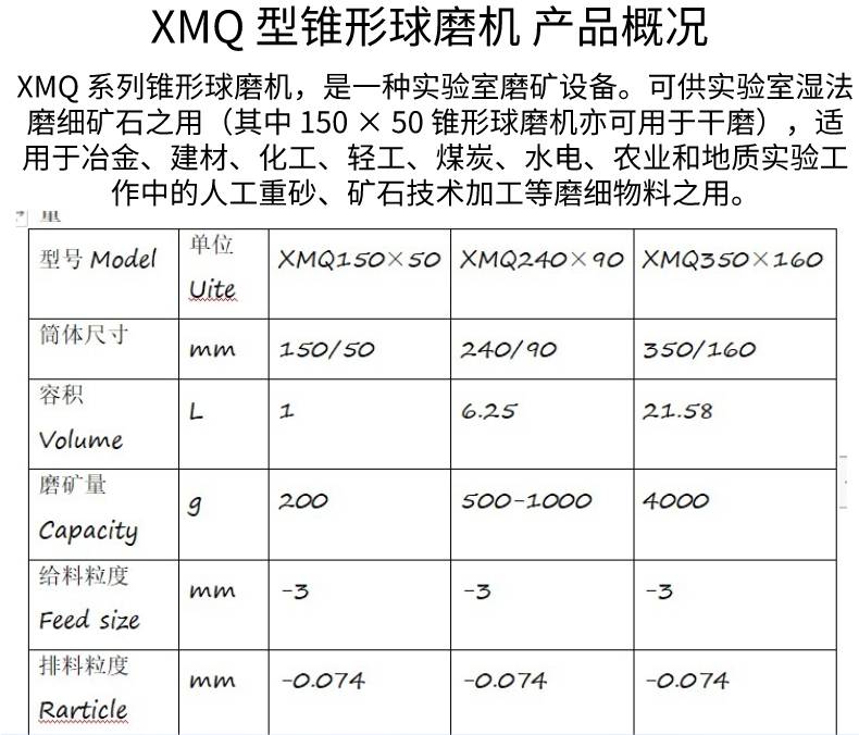 | 进料粒度≤:-3mm | 出料粒度:-0.074mm | 原理:锥形球磨机 |