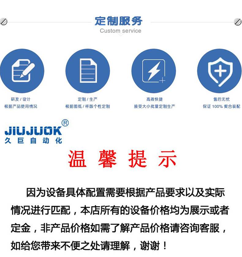 本页信息为深圳市久巨工业设备有限公司为您提供的"久巨高效能电机自动组装配线 专业交流40kw生产线 精密稳定"产品信息,如您想了解更多关于"久巨高效能电机自动组装配线 专业交流40kw生产线 精密稳定"价格、型号、厂家请联系厂家,或给厂家留言。 进入店铺