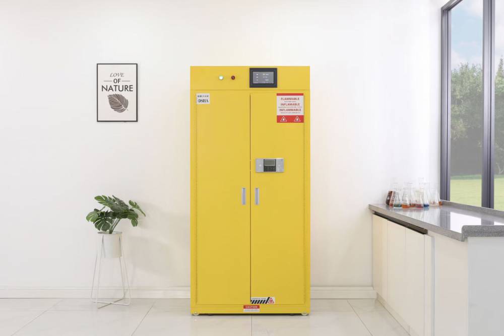 易燃品储存柜 防火防爆防腐蚀自动通风柜用于储存各类危险化学品、防火防爆、防盗、耐强酸碱腐蚀。综合了防火安全柜、耐强酸碱柜,您的危化品储存更安全便捷!高性能的安全柜通过欧盟CE**认证,达到OSHA 标准(美国职业安全健康管理局),符合NFPA(美国**消防协会)第30 条规定的要求用于规范存储易燃易爆液体及危险化学品。防火安全柜整体为双层1.2mm防火钢板构造,两层钢板