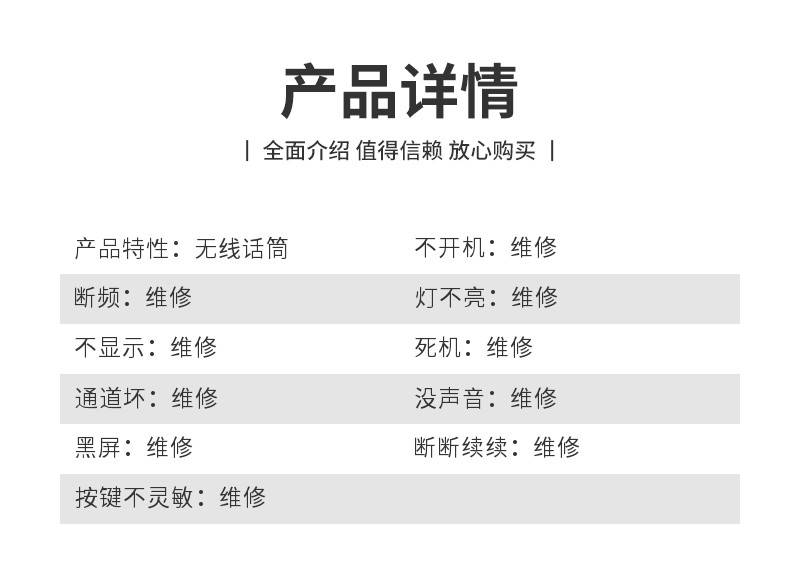 | 产品特性:无线话筒 | 不开机:df | 断频:ert |