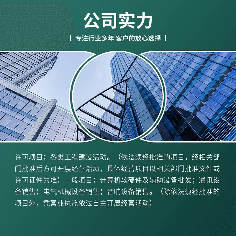 | 经营范围 | 许可项目:各类工程建设活动。(依法须经批准的项目,经相关部门批准后方可开展经营活动,具体经营项目以相关部门批准文件或许可证件为准) 一般项目:技术服务、技术开发、技术咨询、技术交流、技术转让、技术推广;信息咨询服务(不含许可类信息咨询服务);企业管理;计算机软硬件及辅助设备批发;通讯设备销售;电气机械设备销售;音响设备销售。(除依法须经批准的项目外,凭营业执照依法自主开展经营活动) | ||