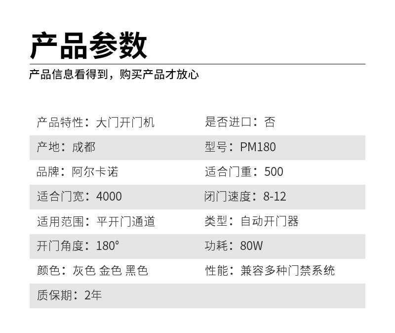 | 型号:PM180 | 品牌:阿尔卡诺 | 适合门重:500kg |