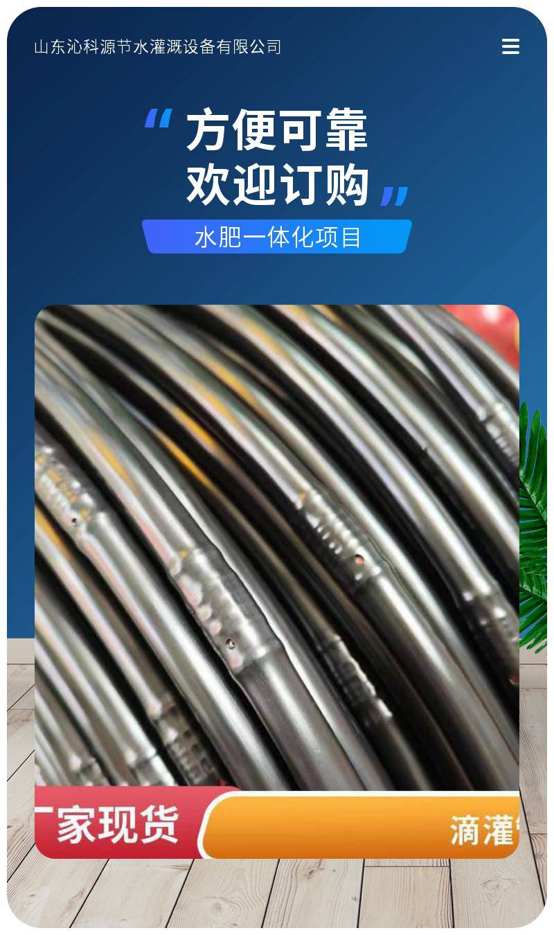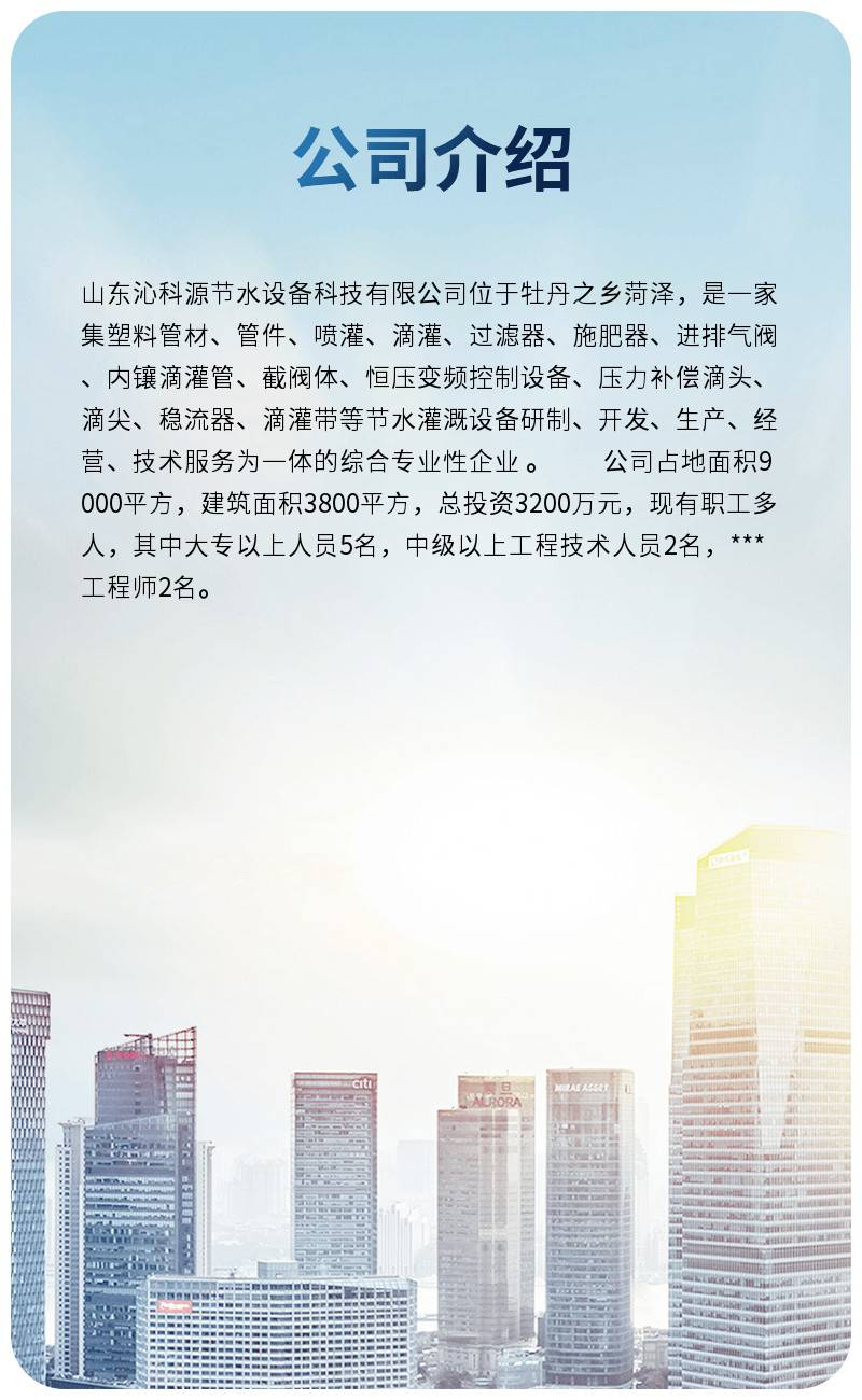 山东沁科源节水设备科技有限公司位于牡丹之乡菏泽,是一家集塑料管材、管件、喷灌、滴灌、过滤器、施肥器、进排气阀、内镶滴灌管、截阀体、恒压变频控制设备、压力补偿滴头、滴尖、稳流器、滴灌带等节水灌溉设备研制、开发、生产、经营、技术服务为一体的综合专业性企业 。 公司占地面积9000平方,建筑面积3800平方,总投资3200万元,现有职工多人,其中大专以上人员5名,中级以上工程技术人员2名,***工程师2名。年产销节水灌溉器材5000吨。 本厂在吸收国内外***技术的基础上,通过与中国农业大学、水利部灌溉研究所等多个科研单位、工程公司的广接接触、合作及自身的不断努力,使山东沁科源节水灌溉设备有限公司,在技术上不断***,质量不断提高,在国内同类产品中处于***水平,先后被***市场保护委员会及***调查统计中心审核评为《中国***品牌》、《质量·服务·信誉AAA品牌》等荣誉。本企业产品品种齐全 、质量***,服务完善,受到各地用户的好评。 公司以科技为本、市场为本、诚信为本的经营理念,凭借雄厚的经济实力,***的技术优势,***的生产设备,完善的质量***体系,科学的管理模式和灵活的营销机制,必将为您提供称心的产品、满意的价格和周到快捷的售前、售后服务。 技术***,物美价廉,诚信服务,是我们永恒的追求。 联系人:张总 电话/微信:15725896699