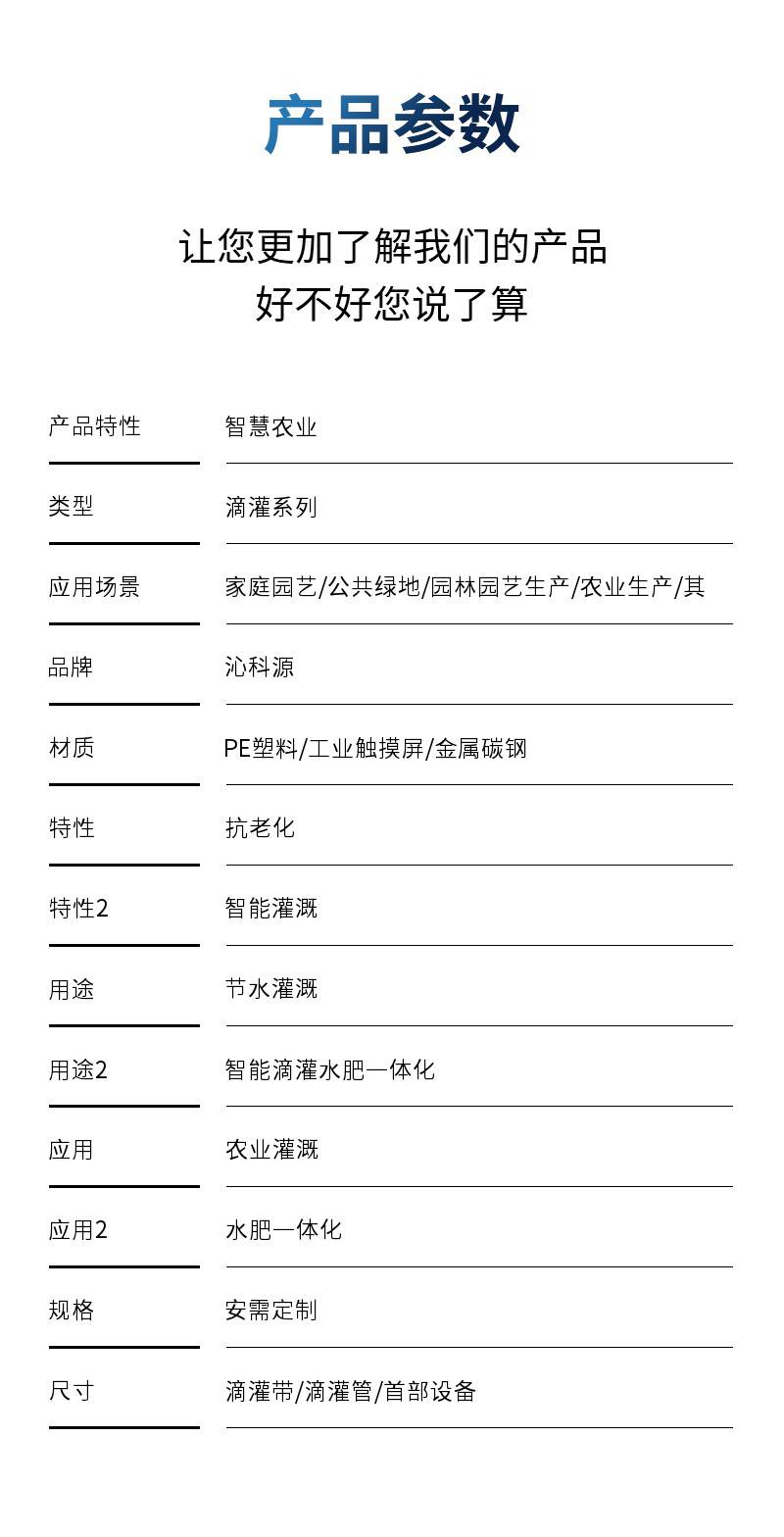 | 产品特性:智慧农业 | 类型:滴灌系列 | 应用场景:家庭园艺、 公共绿地、 园林园艺生产、 农业生产、 其他 |