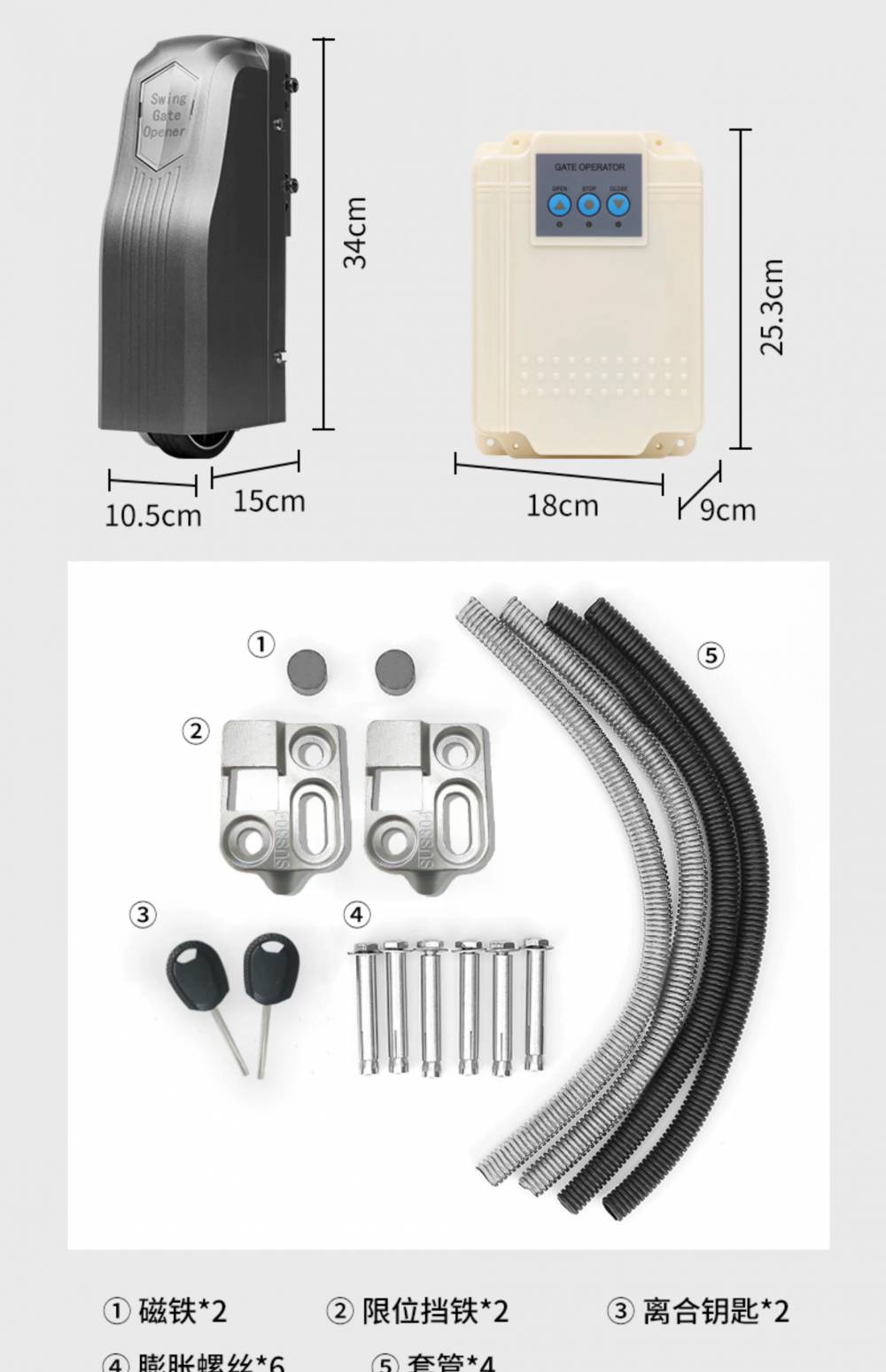 电机2台;控制器1个;遥控器2个;挡铁2块;磁铁2个;离合器钥匙2把;防水套管4个;膨胀螺丝6个;说明书1本。