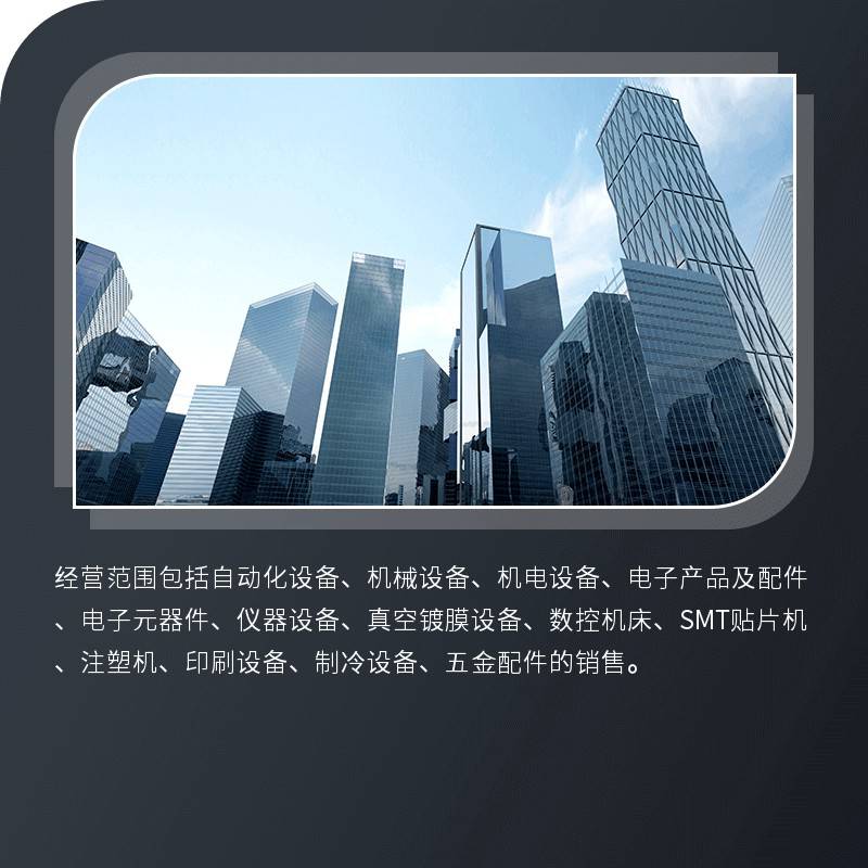 | 经营范围 | 一般项目:机械设备销售;机械设备租赁;电子、机械设备维护(不含特种设备);装卸搬运;电子元器件批发;电力电子元器件销售;特种设备销售;旧货销售;金属成形机床销售;金属切削机床销售;数控机床销售;仪器仪表销售;智能仪器仪表销售;再生资源销售;资源再生利用技术研发。(除依法须经批准的项目外,凭营业执照依法自主开展经营活动) | ||