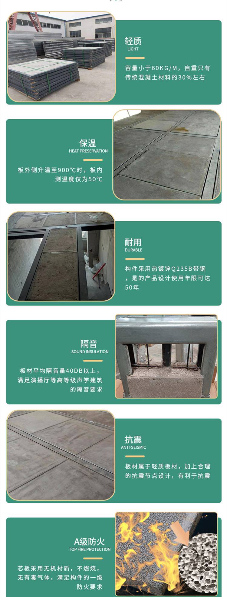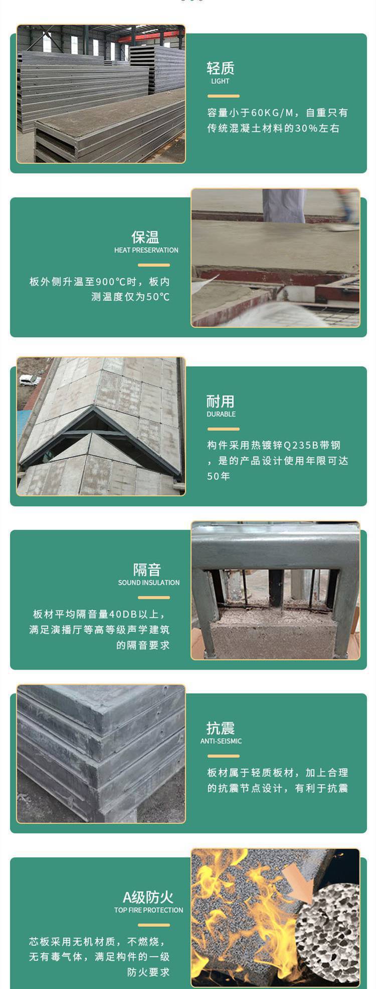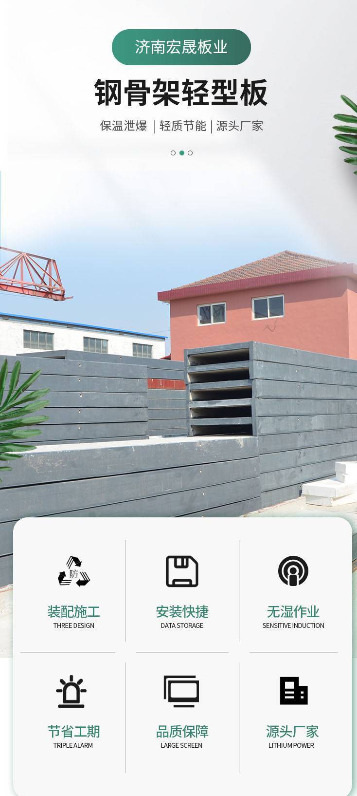 济南宏晟板业有限公司是一家集研发、设计、生产、销售、安装于一体的综合性新型建材企业。同时公司科研人员、 施工人员与清华大学建筑设计院、山东省建筑材料科研所等国家科研机构在理论与实践相结合的基础上共同研发出钢骨架发泡混凝土板,适应了建筑市场的对新型建 材的轻质、保温、高强、耐火、防水、隔音、抗震等的要求,又满足了国家对建筑节能、环保的规定,在既保持了传统钢筋混凝土板安全度高、使用寿命长的优点, 又克服了质量重的缺点,实现了建筑轻型板业的重大突破,填补了国内空白,并取得了骄人的成绩。 公司生产的钢骨架发泡混凝土轻型板包括各种规格型号的大跨度轻型屋面板(网架板)、楼层板、墙板(内外隔墙)、天沟板、泄爆板等系列产品。 ?钢骨架发泡混凝土轻型主要由轻钢架、冷拔低碳钢丝网、无机发泡混凝土芯材、复合抗渗防水等材料组合, 采用独特工艺浇注成型的建筑轻型复合板材,被列入国家建筑高新技术产品。作为主要受力部件的钢骨架,按荷载大小和跨度要求灵活调整,复合填充芯材厚度也可 根据保温隔热的要求调整厚度。板材的形状也可根据图纸制作各种异型要求。板材节点设计合理,安装快捷方便,维护方便,板型灵活,不受国家模具限制,可以按 照建筑设计要求配板,限度满足用户需要。 ?产品主要适用于各类工业厂房、大型仓储、超市、公共建筑、体育场馆、学校、房屋加(夹)层、栈桥走道及其他工业与民用建筑,可以与混凝土结构、钢结构及大跨度空间结构等配套使用,用途广泛。 ?以诚信为根本,以质量求生存,靠科技求发展,向管理要效益是公司发展的根本宗旨。