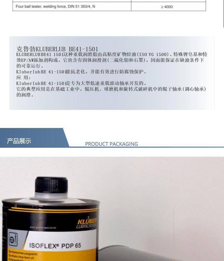 本页信息为荣亨(深圳)润滑油实业有限公司为您提供的"克鲁勃Kluberlub BE41-1501 低速轴承重载润滑脂 重负荷润滑油脂1KG"产品信息,如您想了解更多关于"克鲁勃Kluberlub BE41-1501 低速轴承重载润滑脂 重负荷润滑油脂1KG"价格、型号、厂家请联系厂家,或给厂家留言。 进入店铺