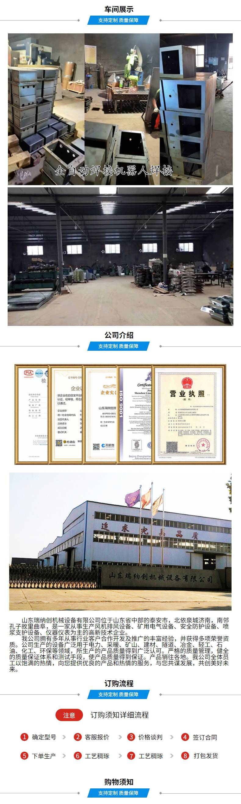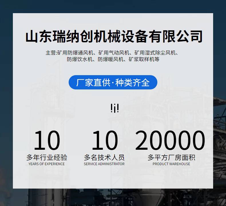 山东瑞纳创机械设备有限公司位于山东省中部的泰安市,北依泉城济南,南邻孔子故里曲阜,是一家从事生产风机排风设备、矿用电气设备、安全防护设备、仪器仪表设备、泵类设备、喷浆支护设备、轨道交通器材等为主的***企业。 拥有多年从事行业客户合作开发及推广的丰富经验,主要产有:矿用湿式除尘风机、矿用气动风机、矿用防爆通风机、工业(防爆)暖风机、防爆饮水机、矿浆取样机、矿用聚乙烯束管、矿用风动潜水泵、矿用气动注浆泵、隔爆水槽、隔爆水袋、压风供水自救装置等产品。并获得多项荣誉资质。 我公司生产的设备***用于电力、采暖、矿山、建材、隧道、冶金、轻工、石油、化工、环保等领域,所生产的产品质量得到***认可。严格的质量管理,健全的***体系和测试手段,使产品质量得到***。产品销往各地。