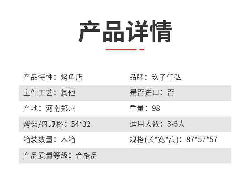 | 产品特性:烤鱼店 | 品牌:玖子仟弘 | 主件工艺:其他 |