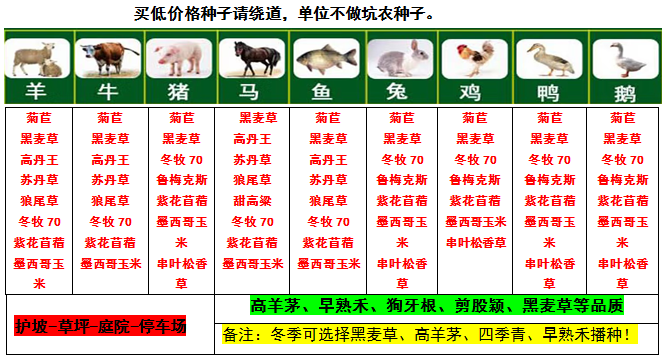 养羊:黑麦草、紫花苜蓿、高丹王、墨西哥玉米、冬牧70黑麦草等