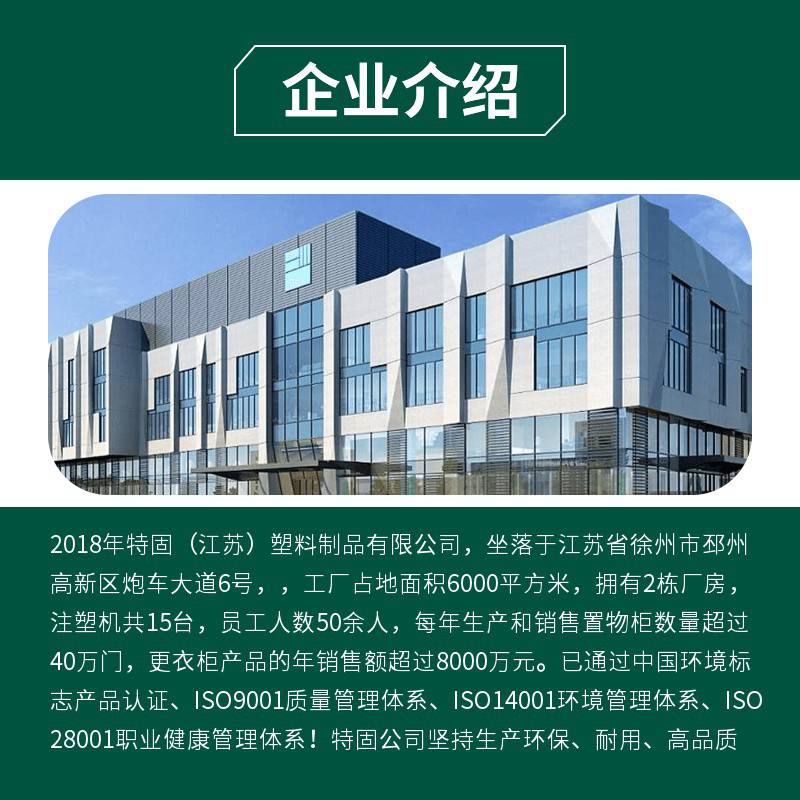 2018年特固(江苏)塑料制品有限公司,坐落于江苏省徐州市邳州高新区炮车大道6号,,工厂占地面积6000平方米,拥有2栋厂房,注塑机共15台,员工人数50余人,每年生产和销售置物柜数量超过40万门,更衣柜产品的年销售额超过8000万元。已通过中国环境标志产品认证、***质量管理体系、***14001环境管理体系、***28001职业健康管理体系! 特固公司坚持生产环保、耐用、高品质产品的宗旨,以中国创造,国际***为愿景,奉行技术***,让产品“说话”的原则,深耕多年的三大类产品均获得多项国家***。我们一直持续改进和创新环保耐用产品,提供更多优质、丰富的环保产品,服务全社会。 特固公司的产品行销遍布世界五大洲,主营产品ABS全塑柜(ABS locker)在市场上更是***。ABS塑料柜以其独特的材质防水、防潮、防腐、不生锈、耐冲击、耐酸碱等优点被广泛的应用于各种特殊场所,如游泳馆、体育馆、工厂、酒店、医院、水上乐园、学校、海滨浴场、健身会所、洗浴中心、大型工矿企业、高尔夫球场等众多场所。