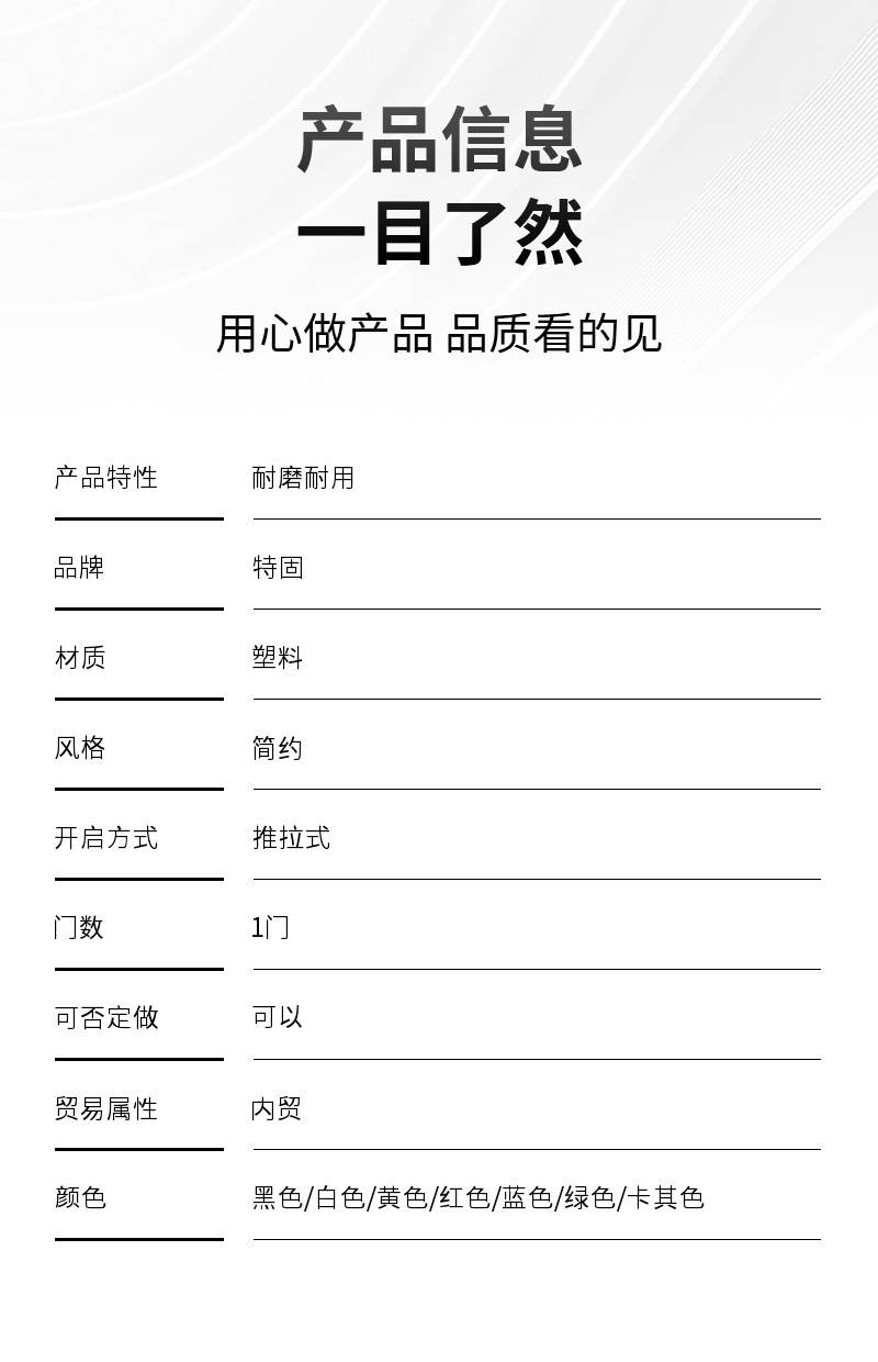 | 可否定做:可以 | 贸易属性:内贸 | 颜色:黑色、 白色、 黄色、 红色、 蓝色、 绿色、 卡其色 |