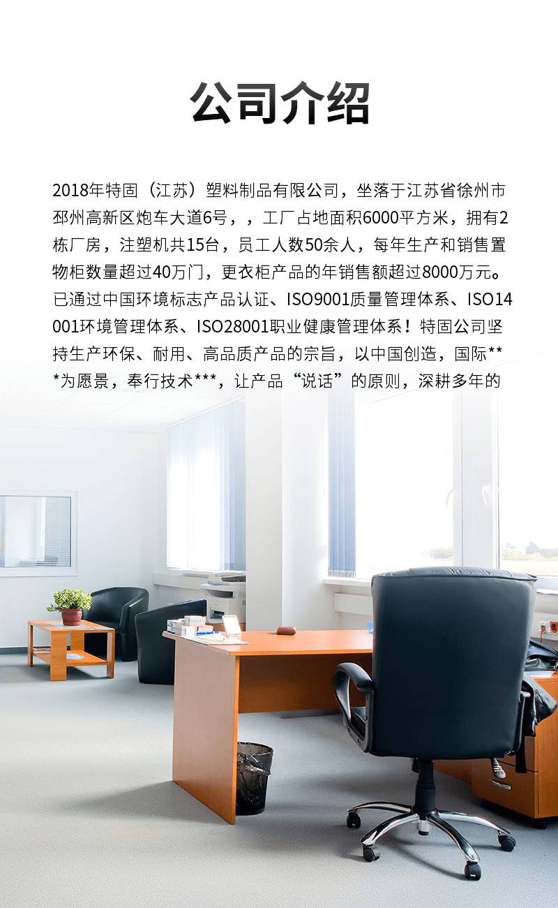 2018年特固(江苏)塑料制品有限公司,坐落于江苏省徐州市邳州高新区炮车大道6号,,工厂占地面积6000平方米,拥有2栋厂房,注塑机共15台,员工人数50余人,每年生产和销售置物柜数量超过40万门,更衣柜产品的年销售额超过8000万元。已通过中国环境标志产品认证、***质量管理体系、***14001环境管理体系、***28001职业健康管理体系! 特固公司坚持生产环保、耐用、高品质产品的宗旨,以中国创造,国际***为愿景,奉行技术***,让产品“说话”的原则,深耕多年的三大类产品均获得多项国家***。我们一直持续改进和创新环保耐用产品,提供更多优质、丰富的环保产品,服务全社会。 特固公司的产品行销遍布世界五大洲,主营产品ABS全塑柜(ABS locker)在市场上更是***。ABS塑料柜以其独特的材质防水、防潮、防腐、不生锈、耐冲击、耐酸碱等优点被广泛的应用于各种特殊场所,如游泳馆、体育馆、工厂、酒店、医院、水上乐园、学校、海滨浴场、健身会所、洗浴中心、大型工矿企业、高尔夫球场等众多场所。