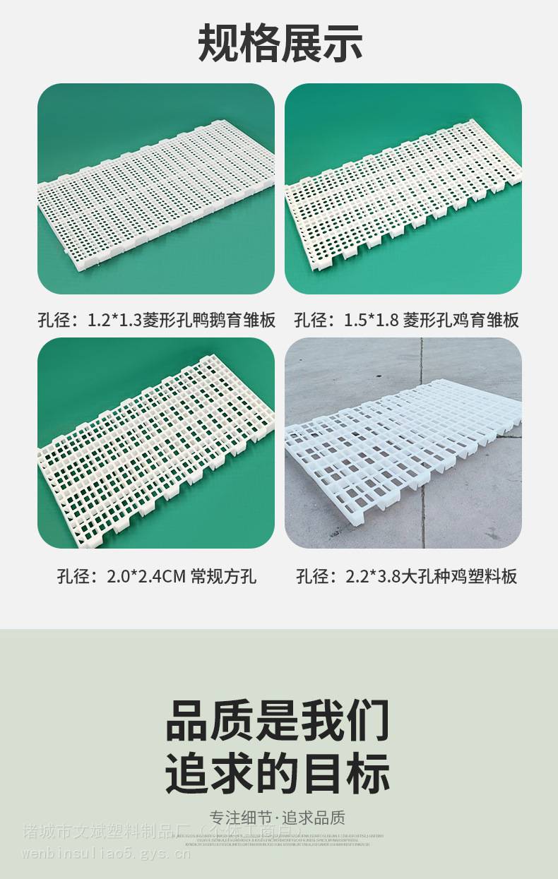 材质PPEPS30R ,添加了剂和抗紫外线吸收剂,颜色为白色。分大块和小块。 大块规格1200*500*40mm, 分方孔和圆孔,方孔孔径是23*20mm,重量约为2.3千克左右。圆孔孔径为20*15mm,圆孔一般育雏用哪个,重量约为2.4千克左右。小块规格是400*500*40mm, 大孔,孔径为23*20mm,重量约为0.8千克。