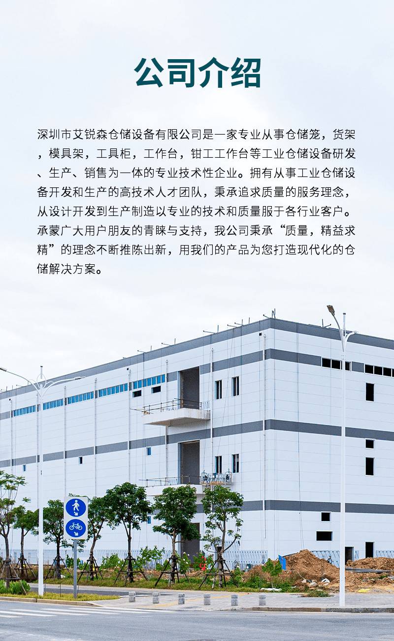 深圳市艾锐森仓储设备有限公司是一家专业从事钳工工作台,仓储笼,货架,模具架,工具柜,工作台等工业仓储设备研发、生产、销售为一体的专业技术性企业。拥有从事工业仓储设备开发和生产的高技术人才团队,秉承追求质量的服务理念,从设计开发到生产制造以专业的技术和质量服于各行业客户。承蒙广大用户朋友的青睐与支持,我公司秉承“质量,精益求精”的理念不断推陈出新,用我们的产品为您打造现代化的仓储解决方案。 1.所有产品皆能享受质量,货架,模具架的质量为10年。 2.公司产品面向全国批发销售,货到验收合格后付款。 3.广东地区客户可享受免费送货上门服务。 4.公司有专业的售后安装服务团队,为您解决安装使用及维护的后顾之优。 5.提供来样定做服务,您只需提供样品或者相关图片,我们有专业的工程师为您出图,打样,品利是您仓储解决方案的。 6.您只需一个电话,我们就会有专人上门看样,出图,报价。 7.所有产品统一以***给各级经销商和个人。 8.公司目前正在扩大发展期,欢迎前来洽谈合作。 9.欢迎大家随时到我们公司现场看货和考察。 你的要求就是我们追求的目标,公司一直秉承“质量,精益求精”的理念,尽力将的产品交付给客户。“诚信经营、客户至上”是我们绝不背弃的宗旨,有理由相信,我们和客户的合作是愉快的、美好的。品利科技期待与您的合作!