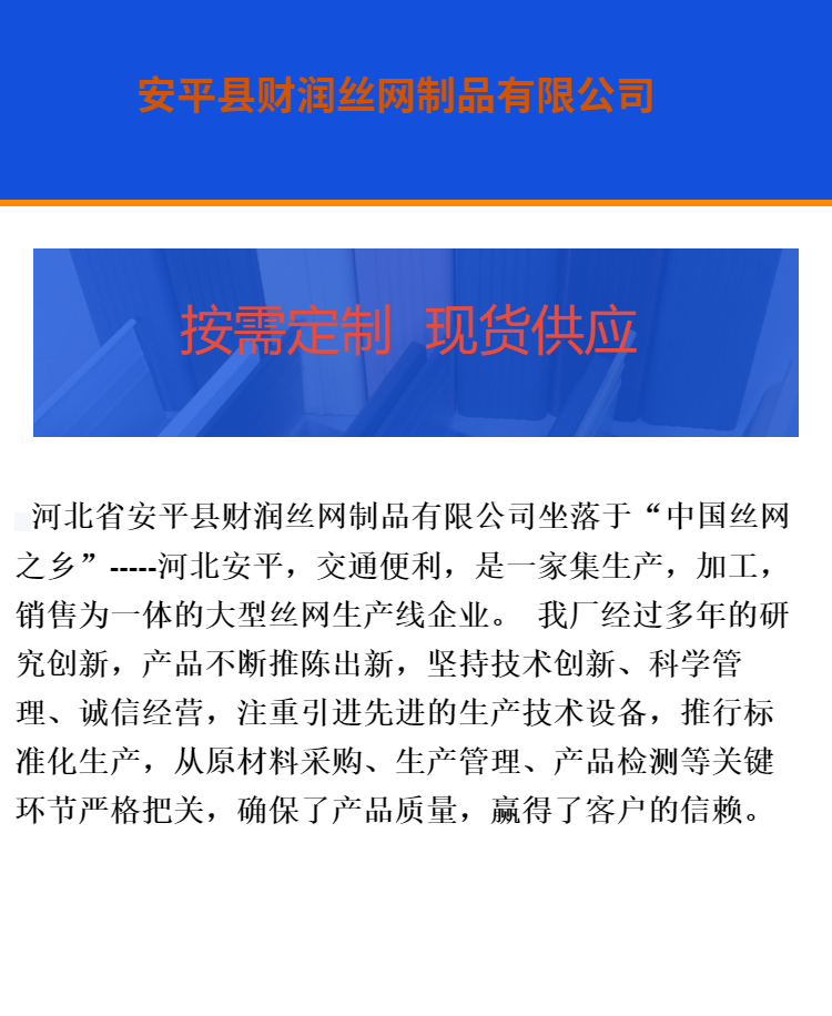 | 经营范围 | 生产、销售:防护网、养殖网、护栏网、建筑用网、仓储笼、围挡、电焊网、玻璃钢格栅、荷兰网、勾花网、筛网、丝网深加工产品、过滤网、爬架网、刺绳、石笼网、冲孔网;销售:排焊机、焊网机械、丝网机械、丝网制品及进出口业务(依法须经批准的项目,经相关部门批准后方可开展经营活动) | ||