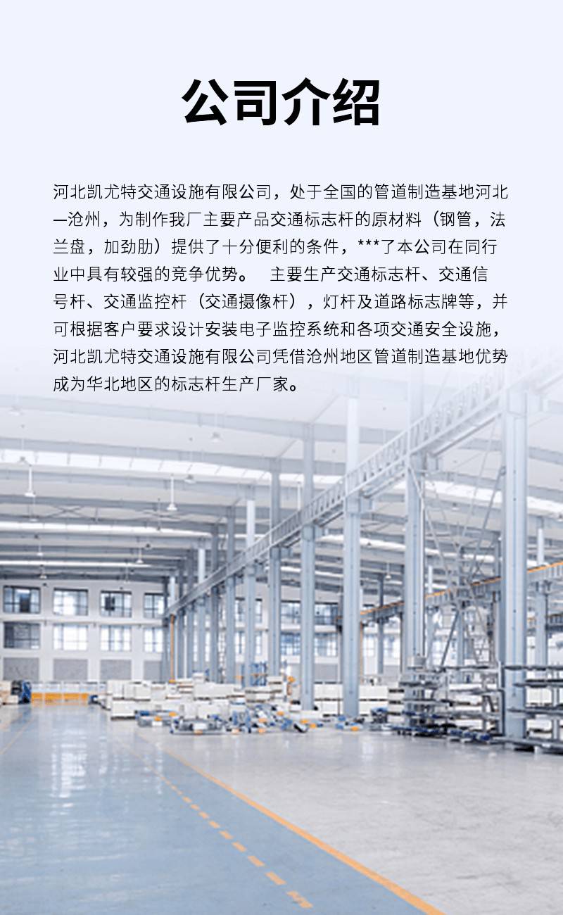 河北凯尤特交通设施有限公司,处于全国的管道制造基地河北—沧州,为制作我厂主要产品交通标志杆的原材料(钢管,法兰盘,加劲肋)提供了十分便利的条件,***了本公司在同行业中具有较强的竞争优势。 主要生产交通标志杆、交通信号杆、交通监控杆(交通摄像杆),各种型号灯杆及道路标志牌等,并可根据客户要求设计安装电子监控系统和各项交通安全设施,河北凯尤特交通设施有限公司凭借沧州地区管道制造基地优势成为华北地区的标志杆生产厂家。 本公司近年来与多家大型实力雄厚的交通设施企业建立了长期合作关系,凭借产品质量过硬,按工期准时交货,***了高速公路按时通车,获得客户的一致认可和好评。 本公司奉行“诚实做人,诚信做事”的宗旨,通过严格的内部管理和科学的营销机制,始终从用户实际需求出发,以用户满意为核心价值,立足客户需求,精益求精,全方位打造“顾客驱动、持续改进、追求***”的质量文化体系,产品赢得了广大用户的信赖和厚爱,销售网络遍及全国二十多个省、市、自治区。 在日益激烈的市场竞争中,公司将继续加大科技投入,严格企业管理,力争以优质的产品质量、合理的销售价格、完善的售后服务、 蓬勃向上的团队精神,去争取更广阔的市场。 本公司设备***,技术力量雄厚,诚信可靠,服务周到,经营灵活。热烈欢迎各界同仁和广大用户来我企业洽谈业务,携手合作,共同发展。 "时间锤炼企业的成长,信念铸造企业方向",我们会在新老客户的支持下携手并进共创双赢,共同***广告事业的辉煌明天。在日益激烈的市场竞争中,公司将继续加大科技投入,严格企业管理,力争以优质的产品质量、合理的销售价格、完善的售后服务、 蓬勃向上的团队精神,去争取更广阔的市场。