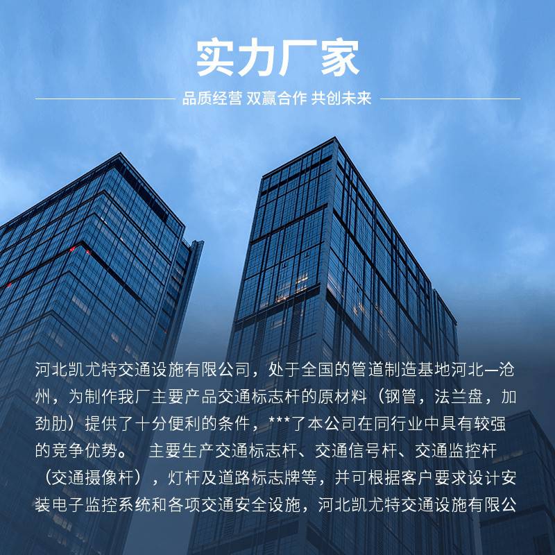 河北凯尤特交通设施有限公司,处于全国的管道制造基地河北—沧州,为制作我厂主要产品交通标志杆的原材料(钢管,法兰盘,加劲肋)提供了十分便利的条件,***了本公司在同行业中具有较强的竞争优势。 主要生产交通标志杆、交通信号杆、交通监控杆(交通摄像杆),各种型号灯杆及道路标志牌等,并可根据客户要求设计安装电子监控系统和各项交通安全设施,河北凯尤特交通设施有限公司凭借沧州地区管道制造基地优势成为华北地区的标志杆生产厂家。 本公司近年来与多家大型实力雄厚的交通设施企业建立了长期合作关系,凭借产品质量过硬,按工期准时交货,***了高速公路按时通车,获得客户的一致认可和好评。 本公司奉行“诚实做人,诚信做事”的宗旨,通过严格的内部管理和科学的营销机制,始终从用户实际需求出发,以用户满意为核心价值,立足客户需求,精益求精,全方位打造“顾客驱动、持续改进、追求***”的质量文化体系,产品赢得了广大用户的信赖和厚爱,销售网络遍及全国二十多个省、市、自治区。 在日益激烈的市场竞争中,公司将继续加大科技投入,严格企业管理,力争以优质的产品质量、合理的销售价格、完善的售后服务、 蓬勃向上的团队精神,去争取更广阔的市场。 本公司设备***,技术力量雄厚,诚信可靠,服务周到,经营灵活。热烈欢迎各界同仁和广大用户来我企业洽谈业务,携手合作,共同发展。 "时间锤炼企业的成长,信念铸造企业方向",我们会在新老客户的支持下携手并进共创双赢,共同***广告事业的辉煌明天。在日益激烈的市场竞争中,公司将继续加大科技投入,严格企业管理,力争以优质的产品质量、合理的销售价格、完善的售后服务、 蓬勃向上的团队精神,去争取更广阔的市场。