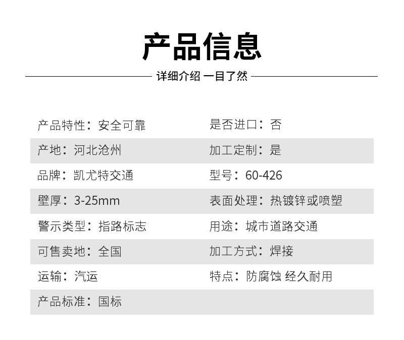 本页信息为河北凯尤特交通设施有限公司为您提供的"热镀锌喷塑景区指路交通标志牌杆生产厂家"产品信息,如您想了解更多关于"热镀锌喷塑景区指路交通标志牌杆生产厂家"价格、型号、厂家请联系厂家,或给厂家留言。 进入店铺 在线留言
