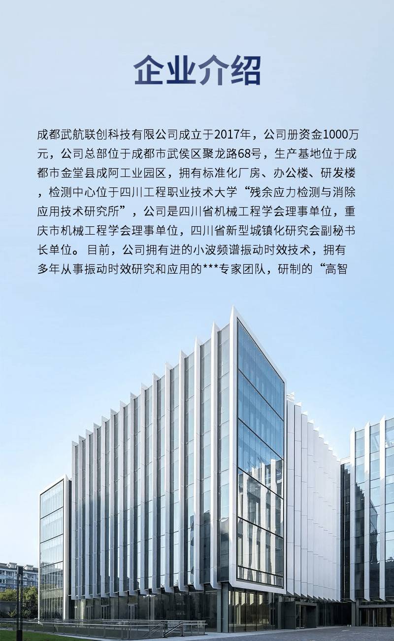 成都武航联创科技有限公司成立于2017年,公司册资金1000万元,公司总部位于成都市武侯区聚龙路68号,生产基地位于成都市金堂县成阿工业园区,拥有标准化厂房、办公楼、研发楼,检测中心位于四川工程职业技术大学“残余应力检测与消除应用技术研究所”,公司是四川省机械工程学会理事单位,重庆市机械工程学会理事单位,四川省新型城镇化研究会副秘书长单位。 目前,公司拥有进的小波频谱振动时效技术,拥有多年从事振动时效研究和应用的***专家团队,研制的“高智慧振动消除应力专家系统”解决了振动时效技术起源几十年未能解决的障碍性难题。其处理效果优于热时效和传统振动时效,成为名符其实的、移动的应力消除炉,可取代以消除应力为目的的热时效。公司产品拥有多项***,通过了武器装备质量管理体系认证证书GJB9001C-2017,***了产品的优良品质、持续发展能力和及时周到的售后服务。 我们始终站在振动时效技术的前沿,以创新的精神,***振动时效技术的发展。我们秉承“求索、学习、创新、诚信、共赢”的理念,本着“合作以诚信为本,创业以专为上,品牌以民为尊,共事以德为天” 的方针做人做事。与广大客户一起共同发展,共创辉煌。 振动消除应力设备已广泛应于航天、航空、兵器、机床、冶金、焊接、铸造等领域。公司的产品在成都飞机132厂,重庆铁马集团256厂、北京北方车辆集团618厂、河南北方红阳5103厂、空军装备部5701厂、中航工业514厂、783厂、784厂、611所、北京北汽越野车研究院、成都航天长征机械厂,中国工程物理研究院六所、七所、中南大学、中石油、东电集团、哈电集团、重庆机电集团、中国电建集团等广泛使用。